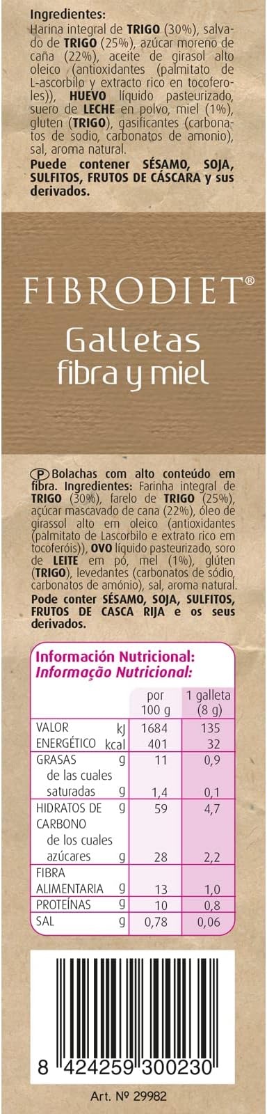 Las Galletas Fibrodiet de Dietisa están formuladas con un alto contenido en salvado de trigo, una fuente natural de fibra que contribuye eficazmente a la regulación del tránsito intestinal. Su consumo regular ayuda a mejorar la función digestiva de forma suave y natural, favoreciendo el bienestar intestinal diario.