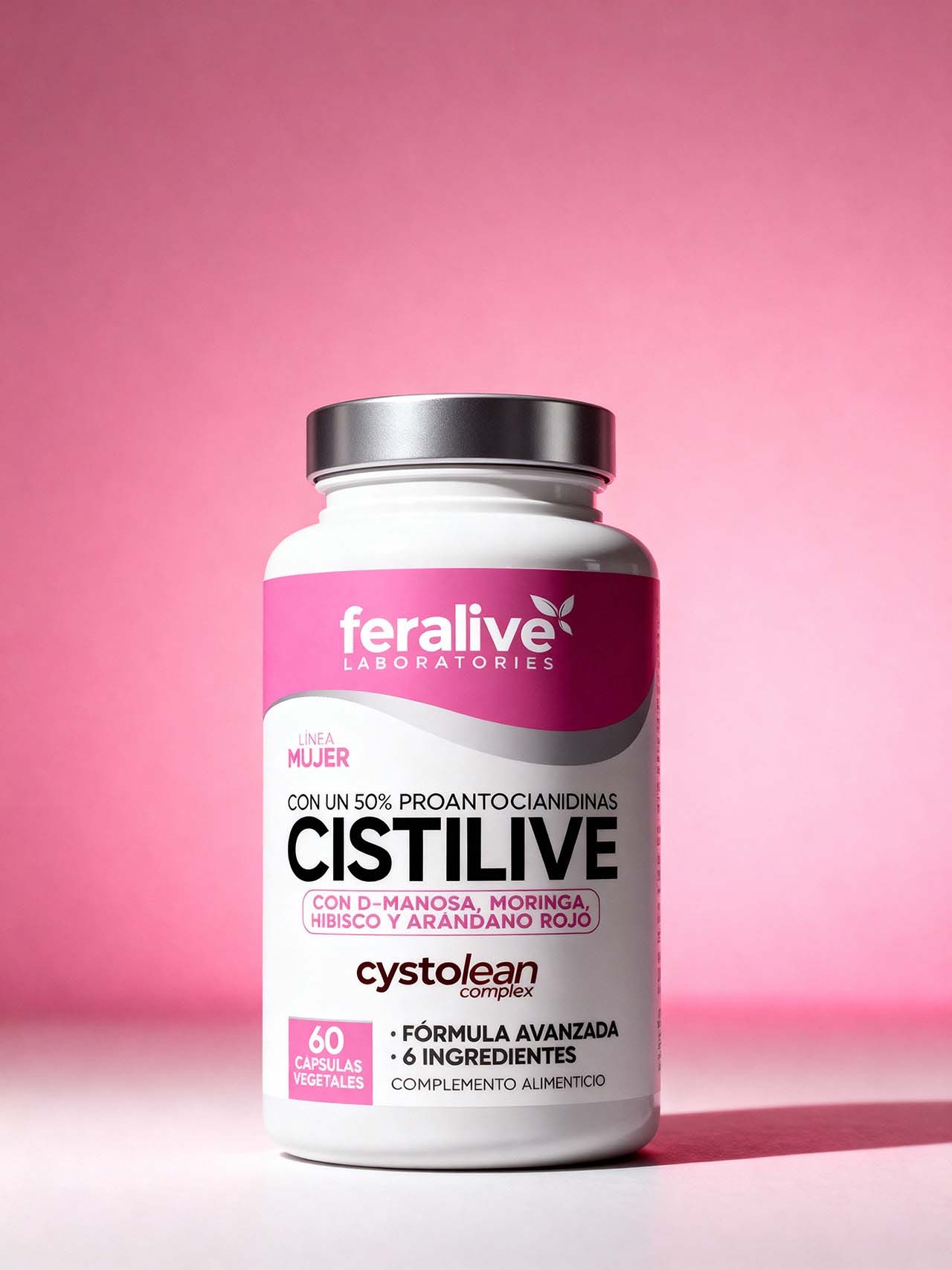 Cistilive es un suplemento en cápsulas vegetales que combina D-manosa, arándano rojo, hibisco, moringa, romero y vitamina C, ofreciendo un enfoque integral para la salud del tracto urinario y el bienestar general.