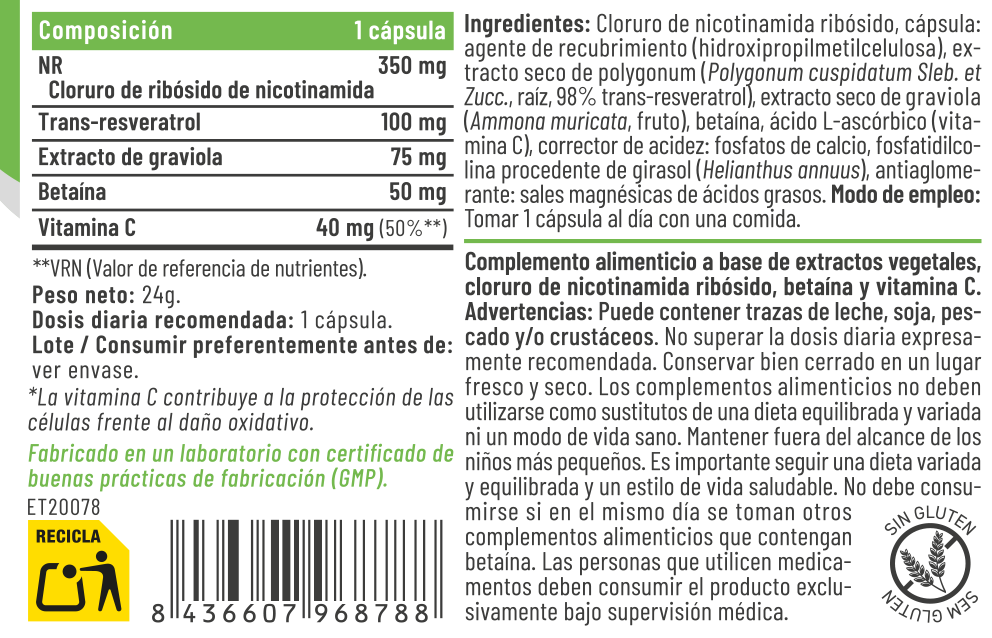 NR+350 es un suplemento en cápsulas vegetales que aporta nicotinamida ribósido, un precursor del NAD+, coenzima esencial para la producción de energía en las células y el mantenimiento de la vitalidad.