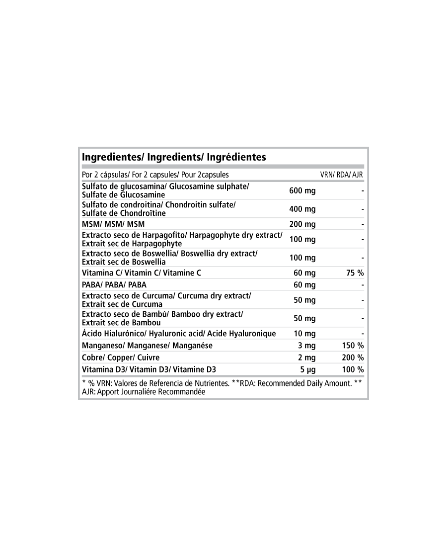 JOINT SUPPORT es un compuesto para las articulaciones, ya que la vitamina D contribuye al mantenimiento de los huesos y los músculos en condiciones normales. Contiene ingredientes tan interesantes como el Sulfato de Glucosamina, Sulfato de Condroitina o Extracto de Harpagofito. También provee de MSM (Metilsufonilmetano), un ingrediente azufrado orgánico.